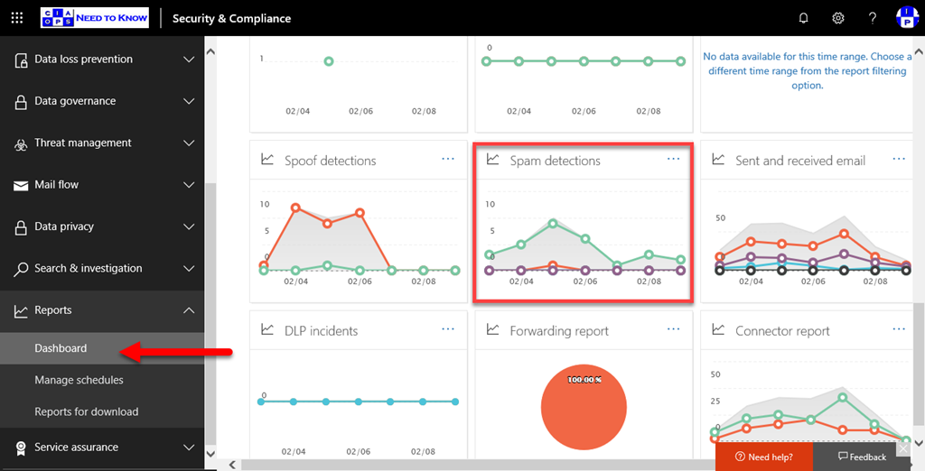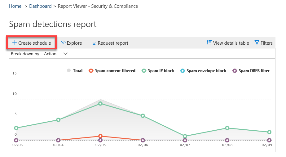 If you go into the Microsoft 365 Security portal and locate the Reports option from the menu on the left and expand it, you should find the Dashboard option. This option, when selected, will show a range of reports like that shown above. You can get more details by simply selecting the body of the tile you wish to view. Here, I’ll select the Spam detections tile to get further information.