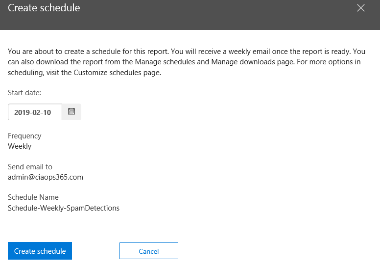 You’ll now see a more focused report but you’ll also notice that many graphs have the Create schedule in the top right hand corner as shown. Selecting this allows you to schedule a report to be delivered via email.