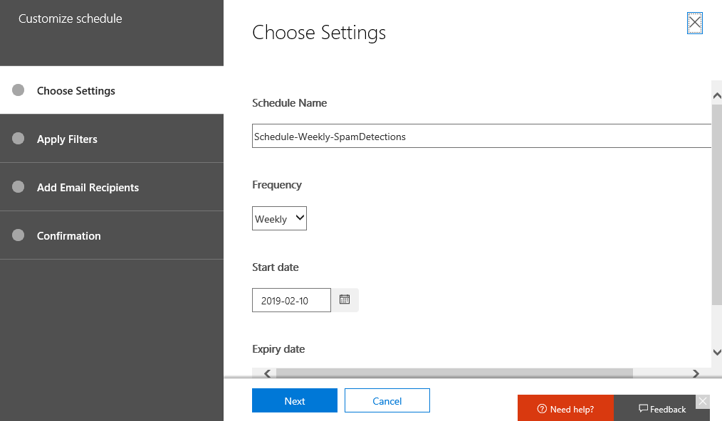 By selecting Create schedule you should see a tile appear from the right with the above options that you can configure.