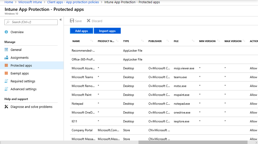 So, let’s say that you have created an Intune Windows 10 App Protection policy like that shown above. When you do you configure a number of Protected apps as you can see. Typically, these a Microsoft products like Office, Internet Explorer, Edge and so on.