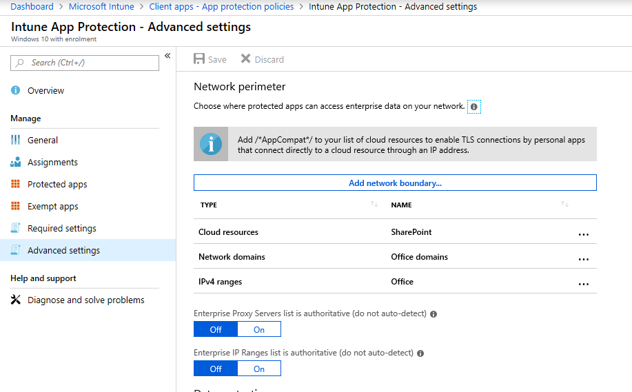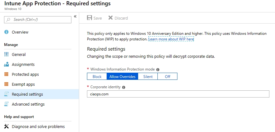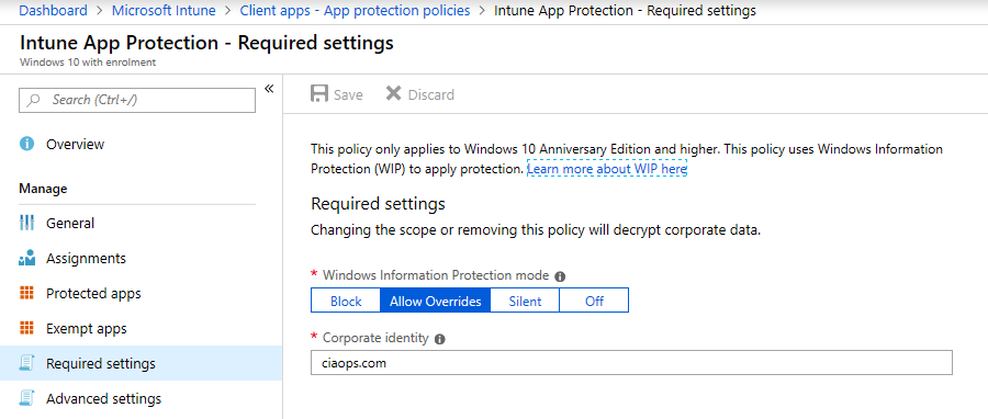 So the Required settings are as shown and utilise Windows Information protection (WIP). The idea is WIP is: