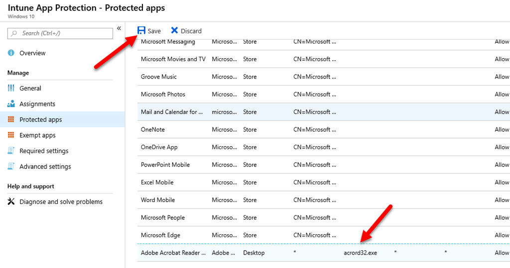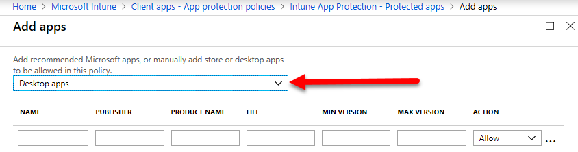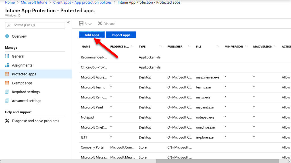 To rectify this situation we need to return to the Protected apps section of the Intune App Protection policy and select the Add apps button as shown.