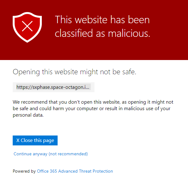 Now, because I’ve configured Office 365 ATP (Advanced Threat Protection) Safe Links in my tenant, when I do click that link in the email I am taken to the above page that warns me that this is bad.