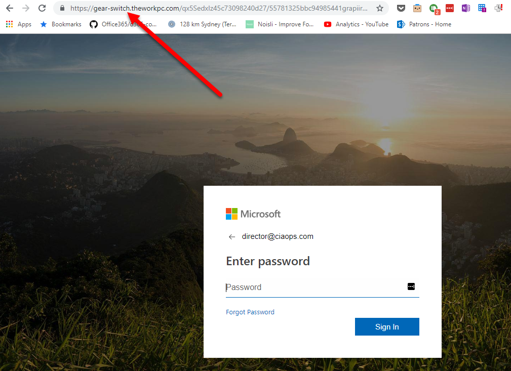 Because I have configured my own Office 365 ATP Safe Links to allow click past this warning just for myself, if I continue on to the ultimate destination page, I see something that looks like a very convincing default Office 365 login page, with my email address already filled in. The idea is, I type my password, thinking this is legitimate and then bingo, I’m phished.
