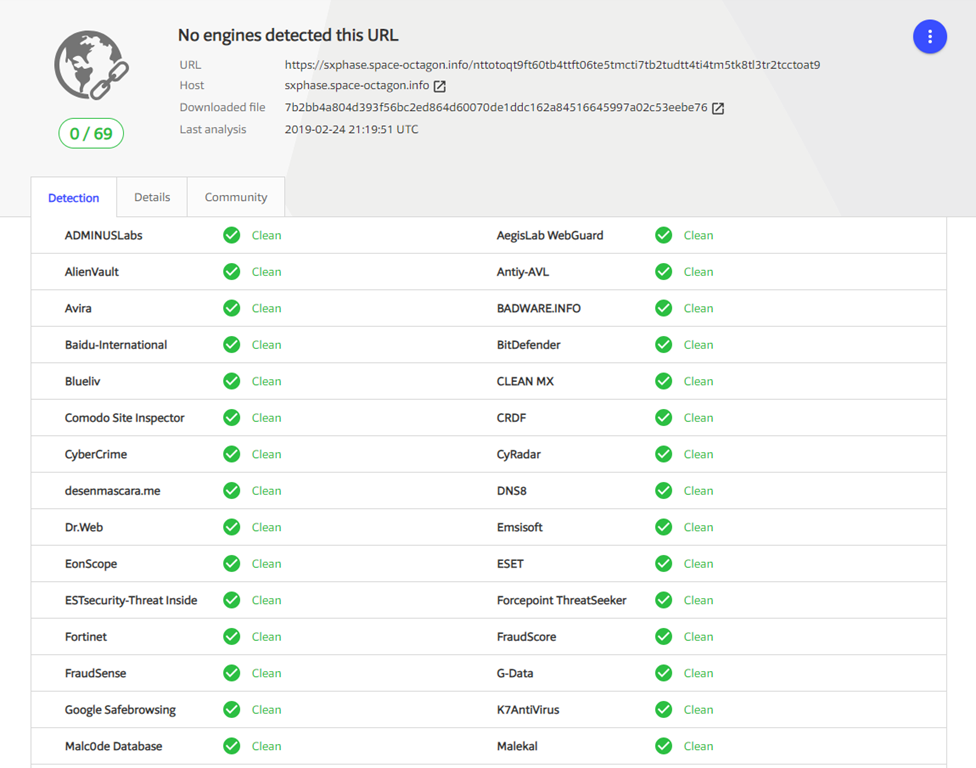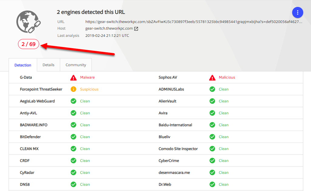 If I now plug in the ultimate destination URL of the attack I do see some confirmation from other vendors that the site is malicious. However, only 2 of 69 vendors (i.e. only about 3%) also rate that link as malicious.