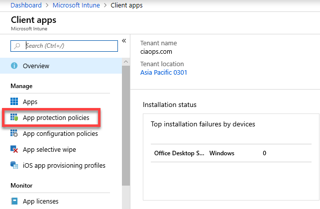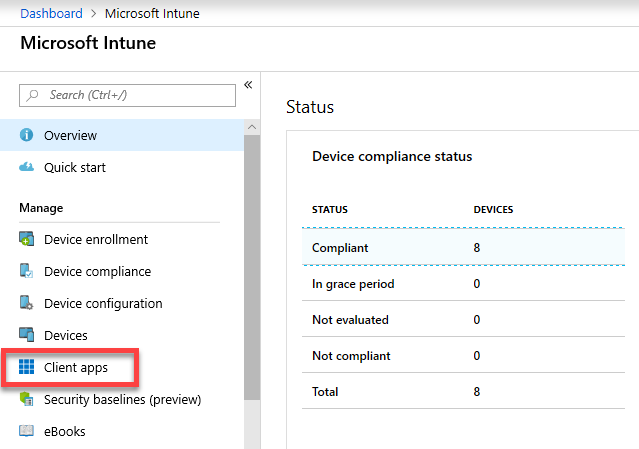 To get there you’ll need to navigate to the Microsoft Intune service in the Azure portal and then select Client apps from the menu on the left.