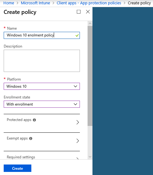 Within Intune I went and created a Windows 10 App Protection Policy.