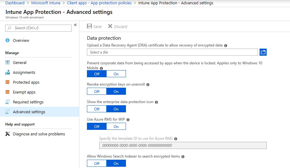 There are additional options if you scroll down further. When data that is protected by WIP is stored on a device covered by this policy, it will be protected by WIP encryption at rest. An option here in the policy allows you to revoke these encryption keys if the device is ‘unenrolled’ from Azure AD. That means, the moment the device is removed from Azure AD, any corporate data will be unable to be read since the encryption keys will be revoked for the device. You can generate and upload a recovery agent as you see above if required, however modern Windows 10 releases will actually recover the key from Azure AD if that same machine is re-joined again to Azure AD.
