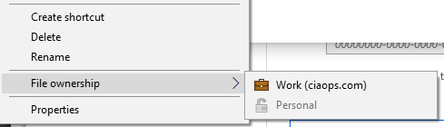 I can change the file from personal to corporate by right mouse clicking, selecting File ownership and then picking the option that I want. Here’s I’d choose Work (ciaops.com) to swap that file to being considered corporate data.