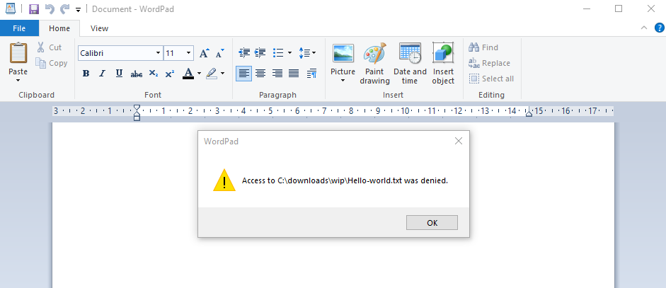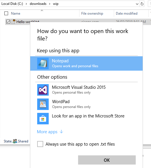 Now that this data is a corporate file, only apps that I have defined as corporate apps can open that file. You’ll see above that Notepad will work on both types of files, corporate and personal, but what happens if you try and open this corporate file with a non corporate app like Wordpad, which, as you can see, says it will only open personal files?