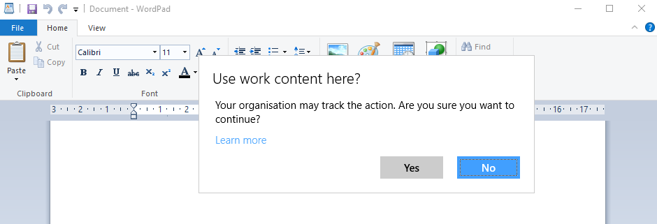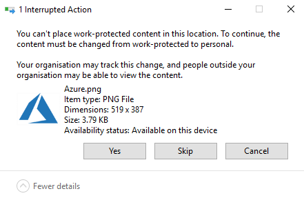As you can see from the above, when I attempt to copy from my OneDrive for Business (corporate location) to a location that is considered non-corporate (local server) I get the above. Because I specified the ability to override I do get a bypass option but you’ll see when I do that, the data I copy will have it’s corporate protection removed and reverted to a personal data.