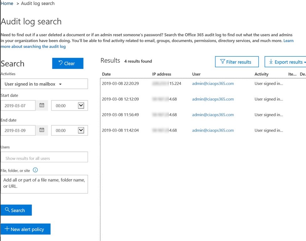 However, as I mentioned, we can no longer search for failed logins, we need to use a different search criteria. I would suggest that you instead run a search using the attribute “User signed in to mailbox” as shown above. That will produce something like shown for all users. Problem with this is that times and dates are in UTC not local time and it is cumbersome to manipulate in a web page. You can of course manipulate by exporting the results to a spreadsheet for more control.