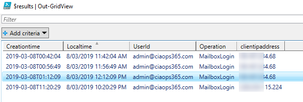 Basically, it will search the Audit log for Exchange Items that are Mailbox logins and send that output to a nice table via the Out-Grid command. As you can see, using Out-Grid you can now easily sort by time by clicking the column heading, and thanks to the script, the times are local not UTC!
