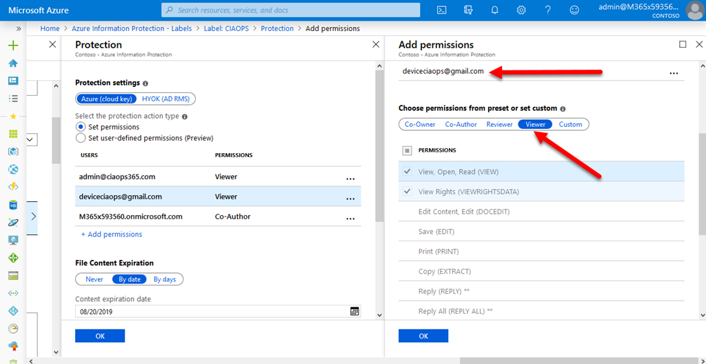 The first step in the process is to define an Azure Information Protection label with the permissions desired. You can see in the above that access for this label is defined for a Gmail account and the permissions for this account are set to “Viewer” (i.e. read only).