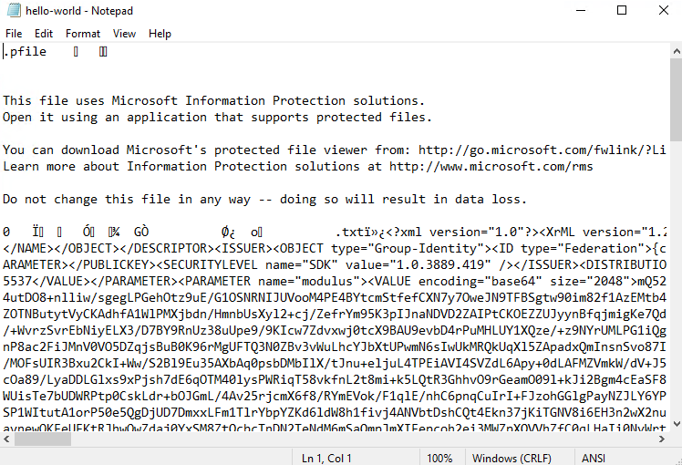 If that protected file is now sent outside the organisation, using any method, and is opened with the native viewer, here Notepad, you’ll note the message saying that the file is protected and to view it you must download the Microsoft’s protected file viewer. This is actually exactly the same client that was used earlier – Microsoft Azure Information Protection Clients for Windows client. So, this will need to be downloaded and installed on the destination machine to allow viewing/access of the file.