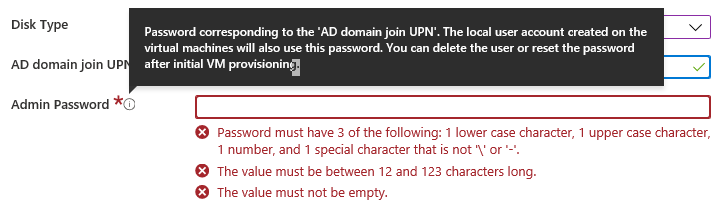As you can see above, the domain join account has to be at least 12 characters long, plus 3 of the following – 1 lower case character, 1 upper case character, 1 number, a special character. That requirement may be different from what your Azure AD or on premises AD requires. My recommendation would be to create a stand alone domain join account that meets the requirements and is only used for joining machines.