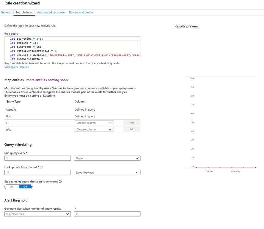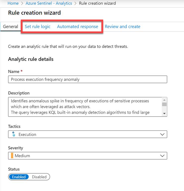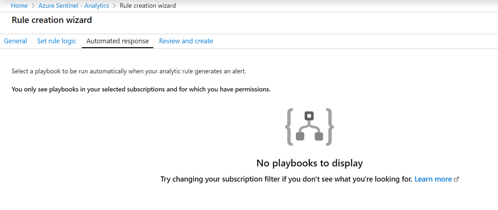 The real power of Azure Sentinel lies in the Automated response step shown above. Here you define what actions will be taken when a alert is generated by the rule. This means that you can have something automatically execute when an alert happen. This could be a remediation process, advanced alerting and more. This allows the response action to threat to be immediate and customisable.