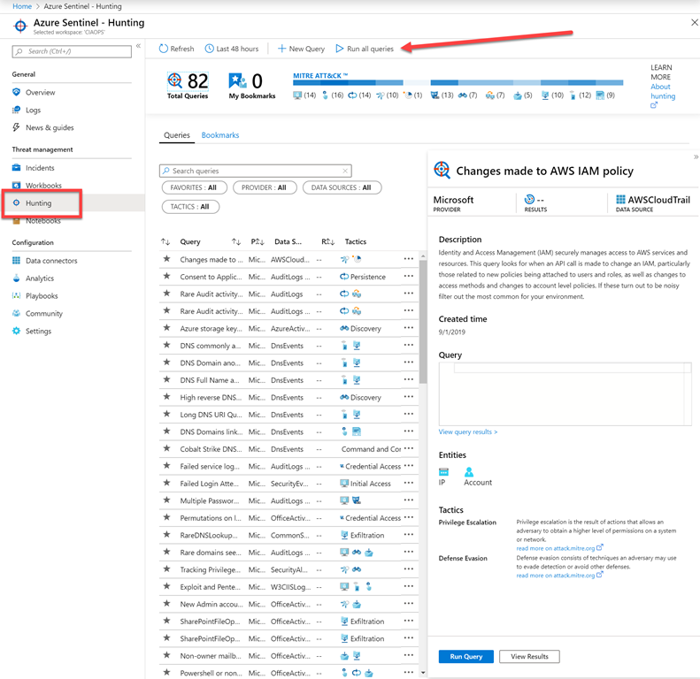 Good security is about being pro-active and Azure Sentinel gives you this via the Hunting option as shown above. This allows you to run standard queries against the data to discover items that may need further investigation and analysis. Note the option highlighted here that allows you to Run all queries at the touch of button. This is yet another hugely powerful option as you can now ‘hunt’ across all your information so quickly. Show me another tool that can do this for both cloud and on prem?