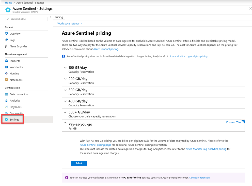 As you can see from the above usage figures I am no where near the 5GB ingestion limit, so all I am currently paying for just Azure Sentinel analysis.