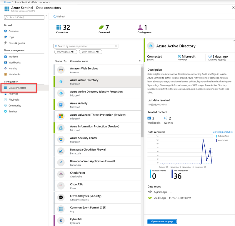 Once you have created the Sentinel service and assigned it a log workspace, the first place to go is to the Connectors option as shown above.