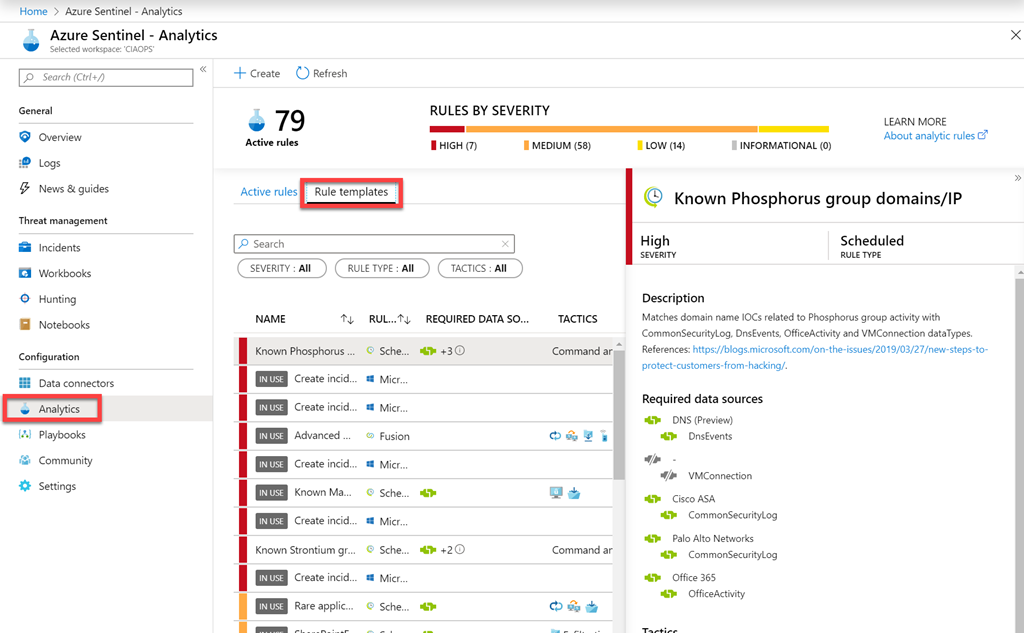 Next, go to the Analytics option, then select Rule templates from those available. These rules are basically queries across your data sources from your connectors. Add in the rules that make the most sense for your environment.
