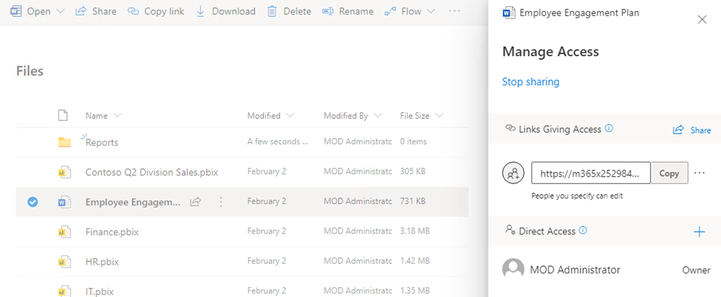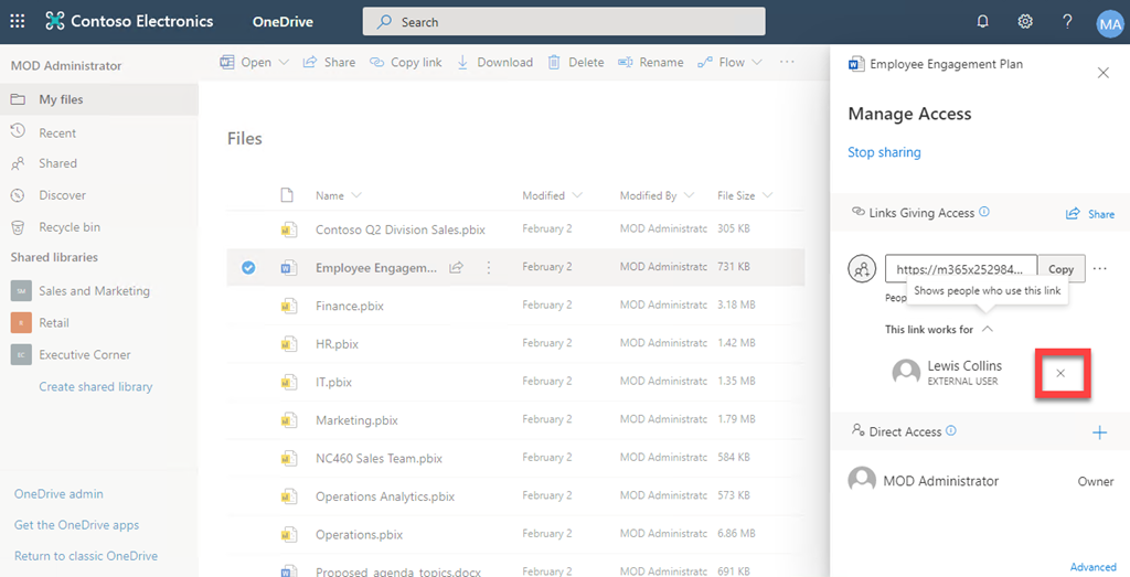 In the above example you’ll see that the file Employee Engagement Plan.docx has been been shared by the owner with an external user (Lewis Collins).