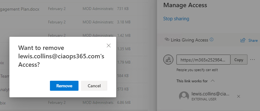If you now look at the sharing option for file(s) in that OneDrive for Business you should find that the removed user no longer appears, as shown above.