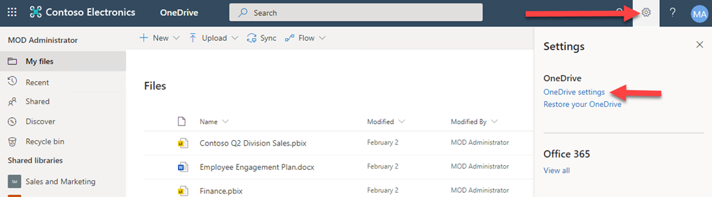 In the source OneDrive for Business, select the COG in the upper right corner and then the option OneDrive Settings.
