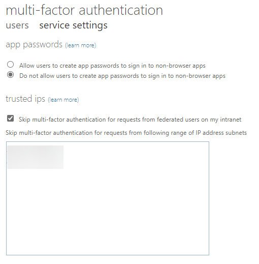 Thus, into the lower box you put the IP address range(s), behind which you do not wish to have MFA enabled. Anywhere else, it will remain enabled and required. Also don’t forget to check the option to Skip above this box.
