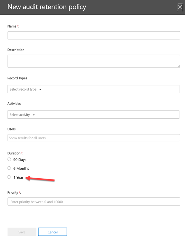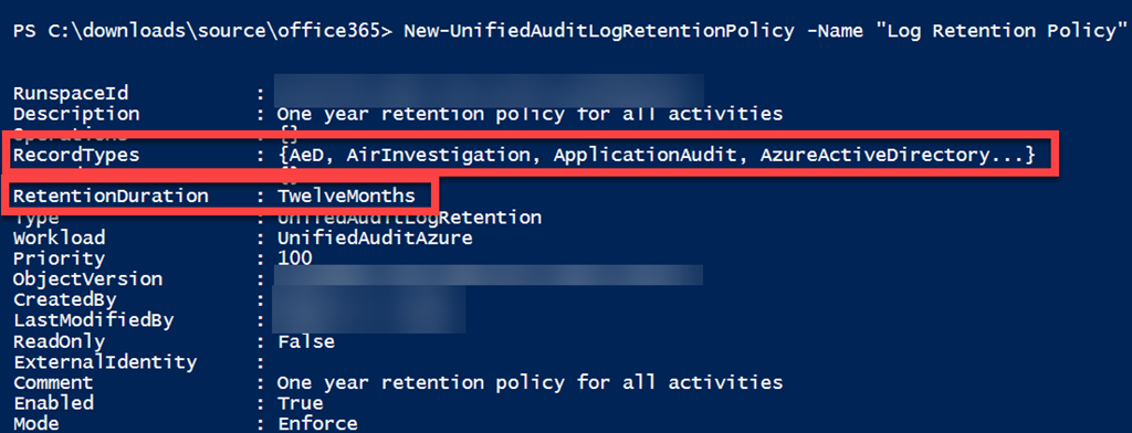 New-UnifiedAuditLogRetentionPolicy -Name “Log Retention Policy” -Description “One year retention policy for all activities” -RecordTypes AeD,AirInvestigation,ApplicationAudit,AzureActiveDirectory,AzureActiveDirectoryAccountLogon,AzureActiveDirectoryStsLogon,CRM,Campaign,ComplianceDLPExchange,ComplianceDLPSharePoint,ComplianceDLPSharePointClassification,ComplianceSupervisionExchange,CustomerKeyServiceEncryption,DLPEndpoint,DataCenterSecurityCmdlet,DataGovernance,DataInsightsRestApiAudit,Discovery,ExchangeAdmin,ExchangeAggregatedOperation,ExchangeItem,ExchangeItemAggregated,ExchangeItemGroup,HRSignal,HygieneEvent,InformationBarrierPolicyApplication,InformationWorkerProtection,Kaizala,LabelExplorer,MIPLabel,MailSubmission,MicrosoftFlow,MicrosoftForms,MicrosoftStream,MicrosoftTeams,MicrosoftTeamsAdmin,MicrosoftTeamsAnalytics,MicrosoftTeamsDevice,MicrosoftTeamsShifts,MipAutoLabelExchangeItem,MipAutoLabelSharePointItem,MipAutoLabelSharePointPolicyLocation,OfficeNative,OneDrive,PowerAppsApp,PowerAppsPlan,PowerBIAudit,Project,Quarantine,SecurityComplianceAlerts,SecurityComplianceCenterEOPCmdlet,SecurityComplianceInsights,SharePoint,SharePointCommentOperation,SharePointContentTypeOperation,SharePointFieldOperation,SharePointFileOperation,SharePointListItemOperation,SharePointListOperation,SharePointSharingOperation,SkypeForBusinessCmdlets,SkypeForBusinessPSTNUsage,SkypeForBusinessUsersBlocked,Sway,SyntheticProbe,TeamsHealthcare,ThreatFinder,ThreatIntelligence,ThreatIntelligenceAtpContent,ThreatIntelligenceUrl,WorkplaceAnalytics,Yammer -RetentionDuration TwelveMonths -Priority 100