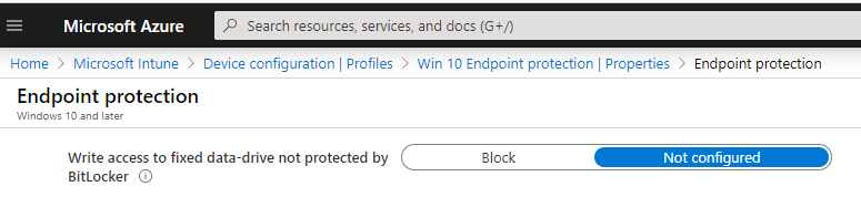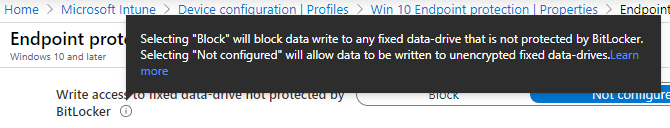 If you can’t install the KB for some reason and you need a quick work around, the issue was linked the BitLocker “Deny write access to fixed drives not protected by Bitlocker” policy and you should clear any group policy and set the following in Intune to Not configured as well as a work around.