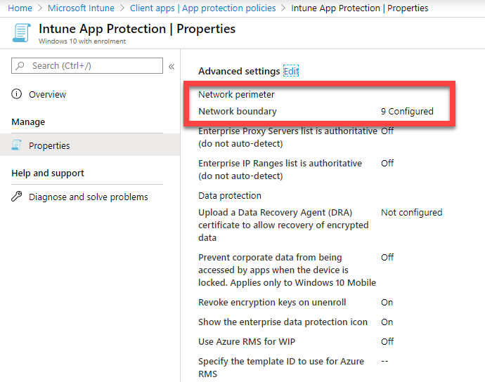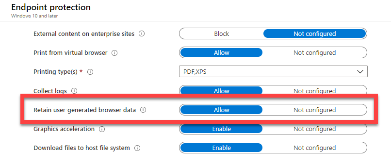 In Enterprise-mode my initial questions was ‘Where do I define my sites?’. As it turns out, this isn’t particularly obvious, so it took me a while to track down. The definitions for the sites you want to ‘white list’ for WDAG are actually in the Intune App Protection policy settings.