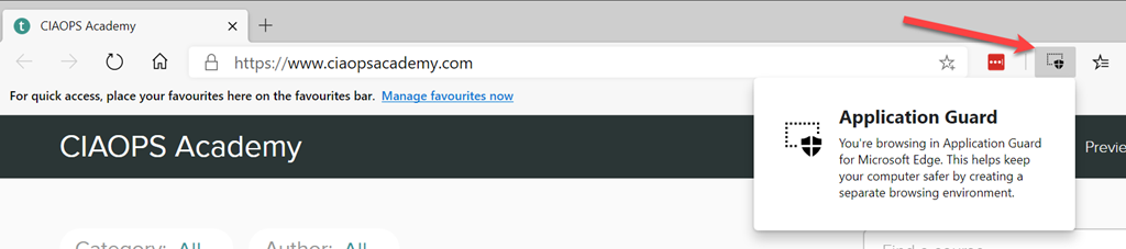 If you browse to a non ‘white listed’ site (here www.ciaopsacademy.com), then a WDAG session is launched. You’ll see WDAG spin up, if it is the very first time it has been activated. You’ll then see the browser load the site in question and then you’ll notice a WDAG icon in the toolbar as shown above, which, when opened, will let you know that the current browser is using WDAG.