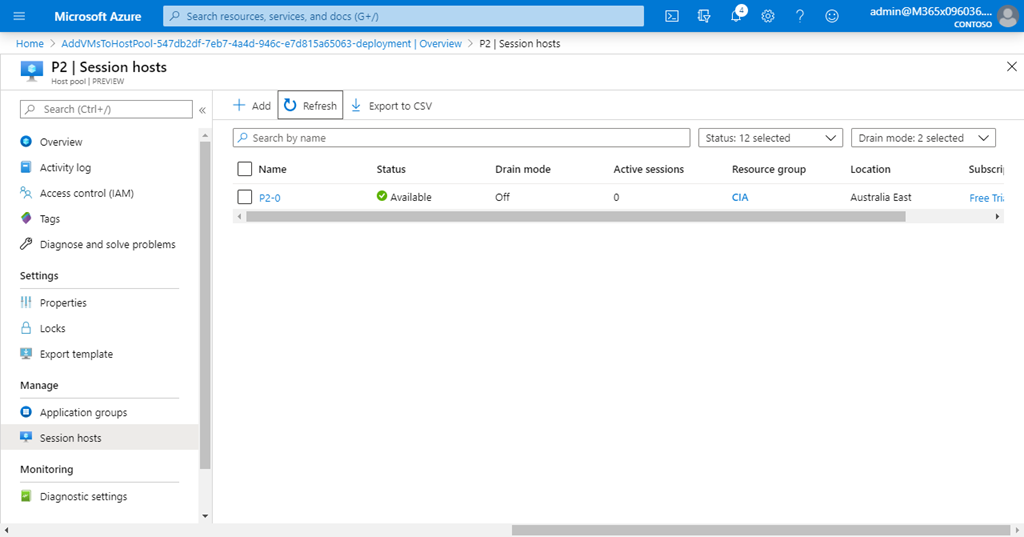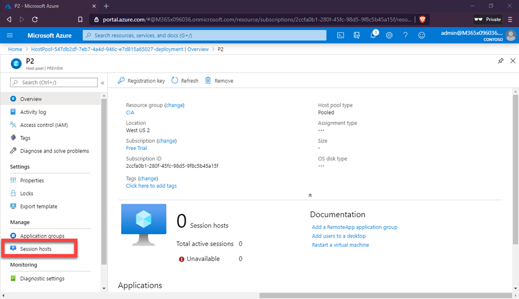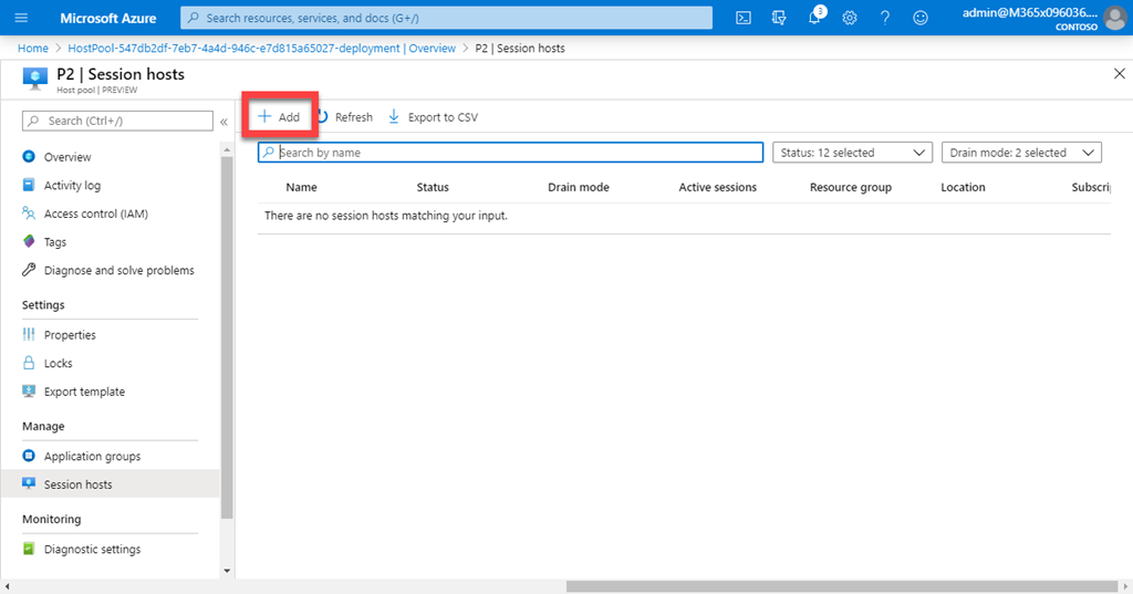In this case, I selected Host Pool P2 and see the above screen which should also see some similar. You will note that this Host Pool currently has no Session Hosts in it. To add a Session Hosts (i.e. a VM), select the Session hosts from the menu on the left as shown above.