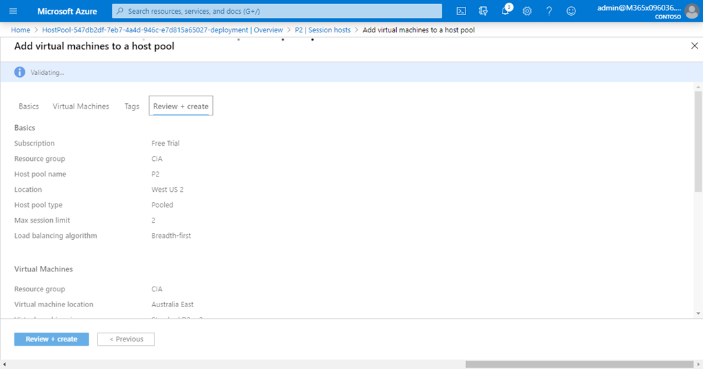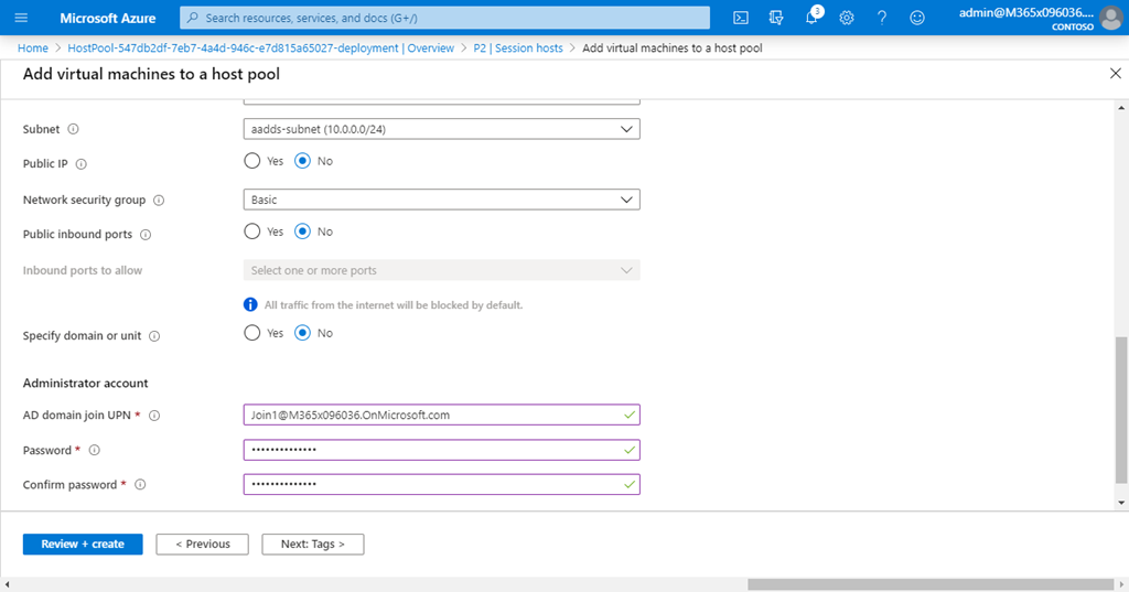 The last fields on this page ask you for an account to be used to join the hosts to the domain. This can be the source of plenty of pain and frustration. My advice, is to test and ensure that this account actually can manually logon to Azure without MFA and also can actually add machines to the domain. Remember, this join account can’t have MFA enabled due to the automated nature of the join process about to take place. This may require manually adding a VM to the domain using this account, to verify before completing this wizard. Also, be aware that if you get the wrong details and continue with the wizard, not only will the attach fail but the account you are using might get locked out! So, lots to be aware of here and I highly recommend double checking everything as this is the most common point of failure in my experience. Remember, once the hosts are joined you can disable the login for your join account to keep it secure.