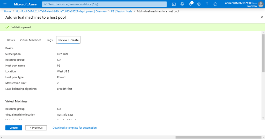 If the validation passes, you should see a green banner at the top of the page as shown and the Create button at the bottom will become available. Select this to continue.