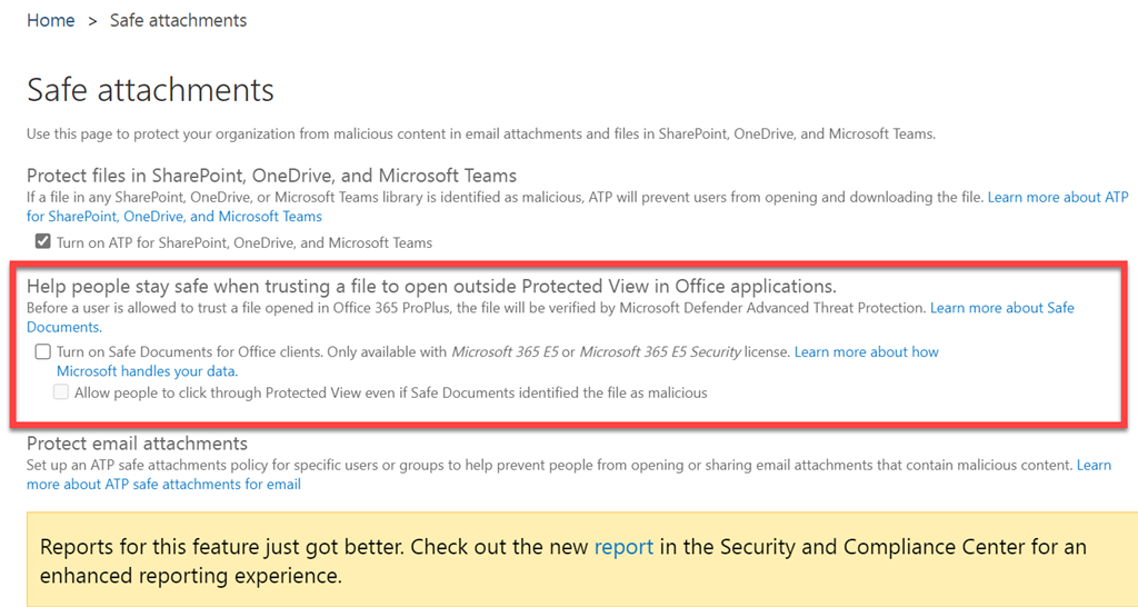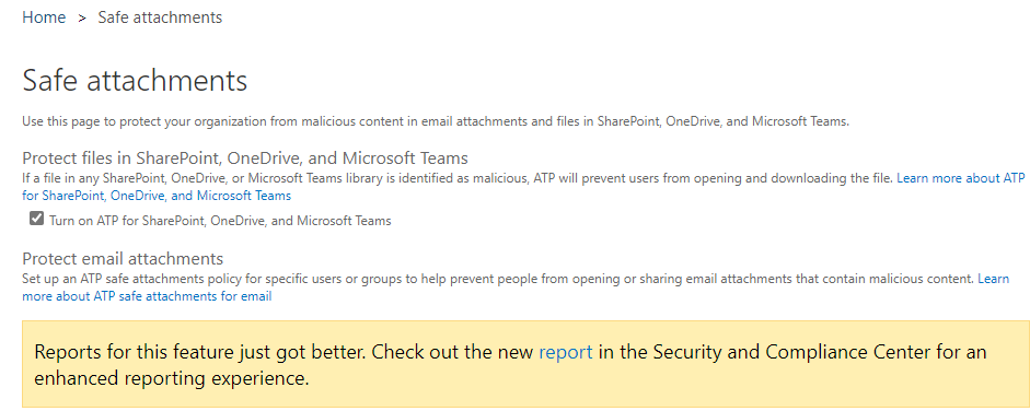I then went and took a look at the Safe Attachments options in my web console, as shown above. I didn’t see any differences there.