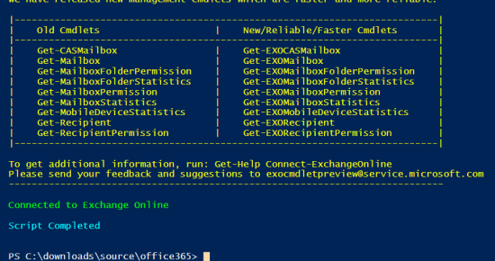 Once you have your PowerShell environment setup, you simply run the o365-connect-exov2.ps1 script as shown above.