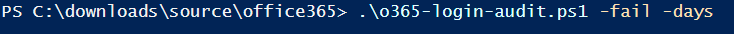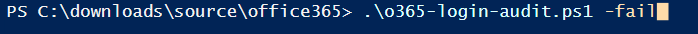If you instead run the o365-login-audit.ps1 script with the –fail parameter as shown above,