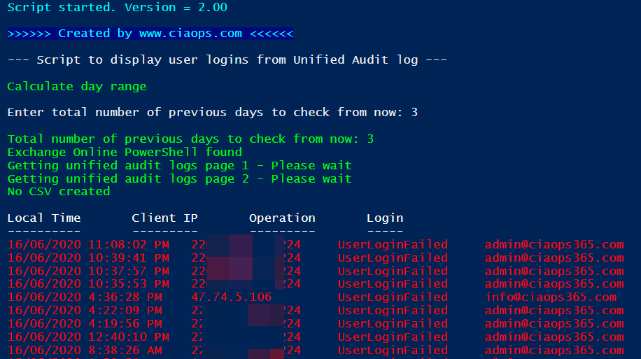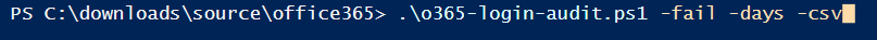 If you run the o365-login-audit.ps1 script with the –days parameter as shown above,