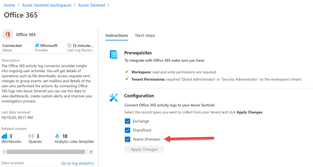The first is a new option in the Office 365 Data connector to allow you to bring Teams data from the Office 365 Unified Audit Log into Sentinel. All you need to do to enable this is open the Office 365 connector and select the Teams check box as shown above.