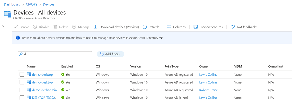Azure AD joined devices will be shown as above with the join type as Azure AD joined. You will also note that these devices have MDM (device) management being Office 365 Mobile and a field for whether they are Compliant.