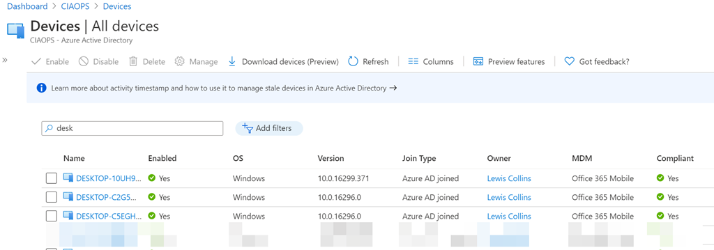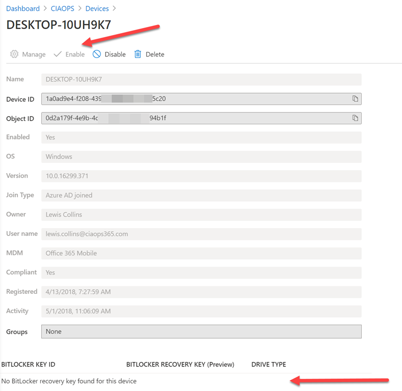 If you select an Azure AD joined device you largely get an inventory, as shown above, of that device, plus the ability to Enable, Disable and Delete the device via the top menu. Another benefit is the ability to capture BitLocker keys as well, which are shown at the bottom of the device if BitLocker is configured on the device.