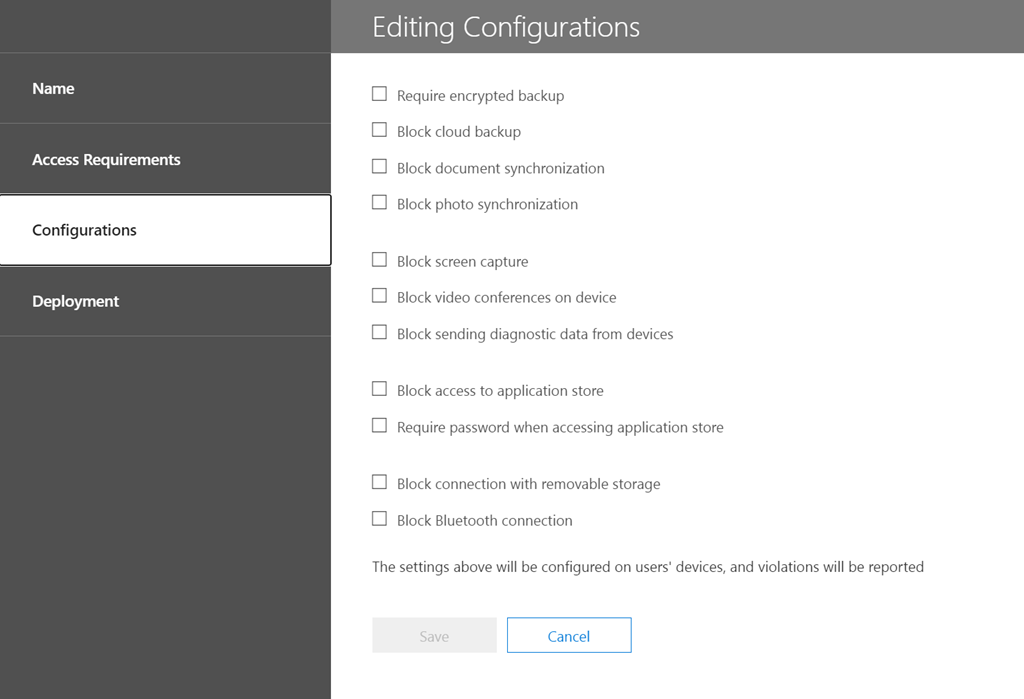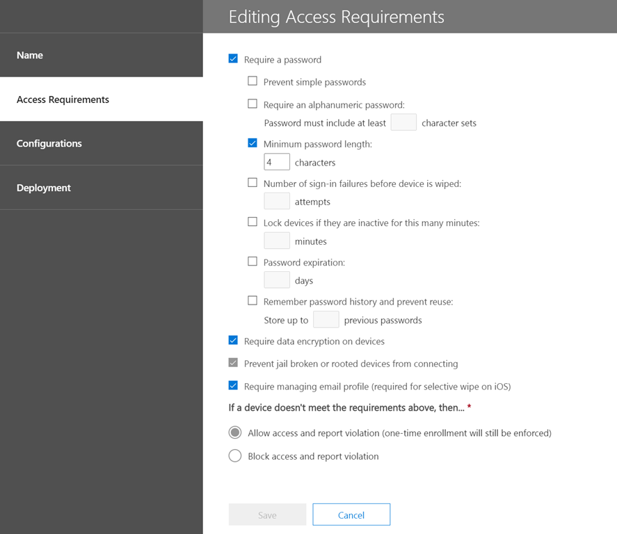 Both of these options are quite limited and don’t provide any specific device OS/type targeting. They also roll compliance (Access requirements) and configuration together into a single policy, which lacks a certain amount of flexibility. In essence then, this is why the out of the box device management that comes with Office 365, known as Office 365 Mobile is ‘basic’. This is why something with more power and granularity is required if you are serious about device management.