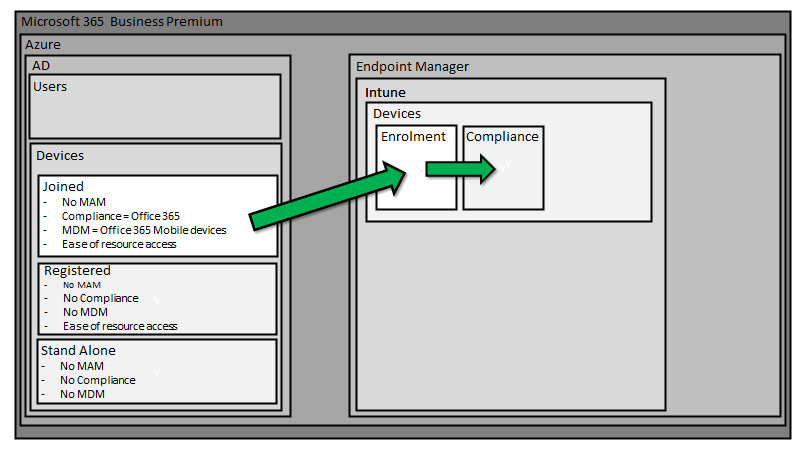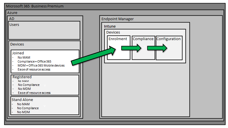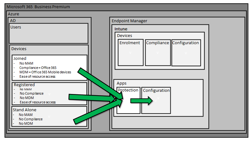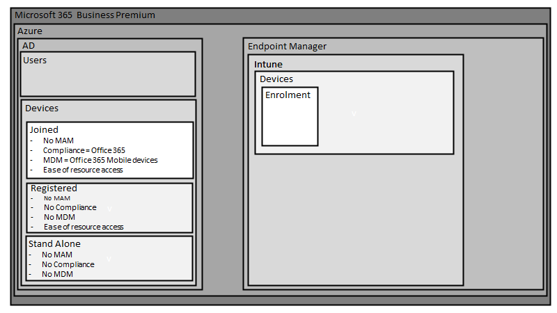 The way that devices running Windows 10, iOS, Android and MacOS get managed with Microsoft 365 Business Premium can be daunting to those who aren’t familiar with it. The common way that it is explained is from the inside out, that is via policies in Intune first, rather than starting with the big picture and working in.