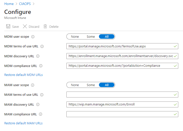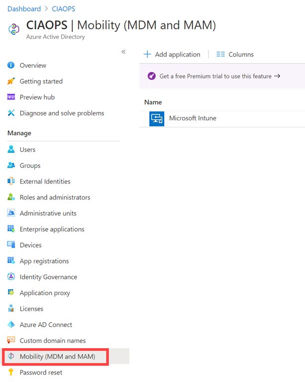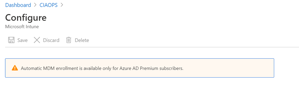 If you look at your Azure AD in the Azure portal you’ll see the option Mobility (MDM and MAM). If you select that, you’ll probably see a Microsoft Intune option on the right as shown above.