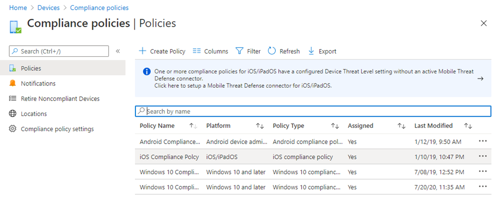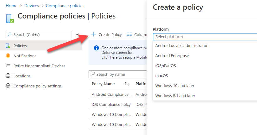 You can configure device compliance policies via Endpoint Manager | Devices | Compliance policies as shown above.
