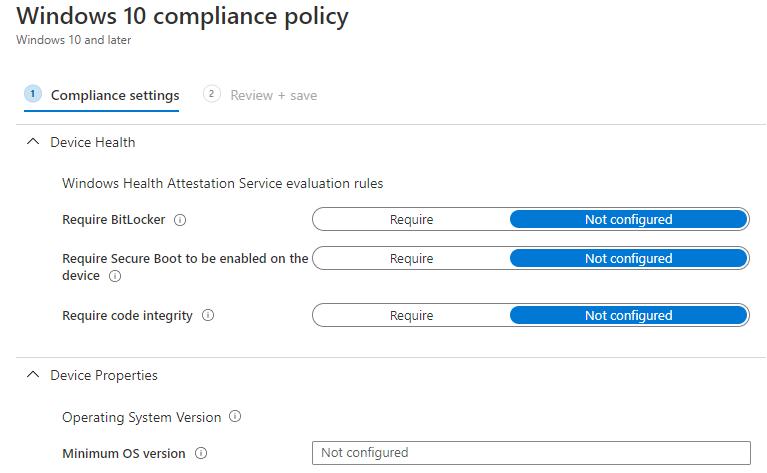 Here you create as many different Compliance policies as you wish. Typically, you have one per device operating system, however you can have more if you wish. A good example of why you might have two Windows 10 policies is to handle machines that have and those than don’t have TPM capabilities. Disk encryption is a compliance setting you can check for and enforce. However, you may not want to enforce full disk encryption via BitLocker for machines that don’t have inbuilt TPM chips for example. Thus, two separate compliance policies would be required. One to check machines with a TPM capability and one for those without.