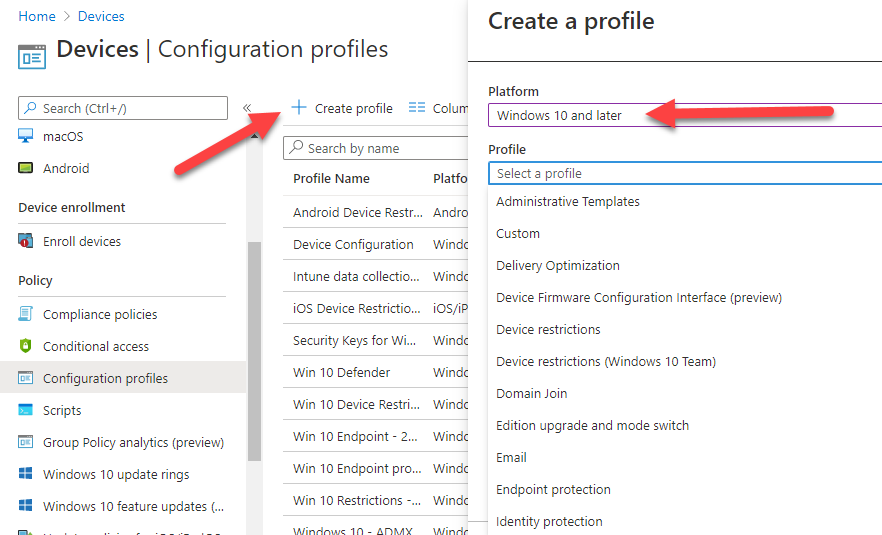 These policies are found by navigating to Endpoint Manager | Devices | Configuration policies as shown above.