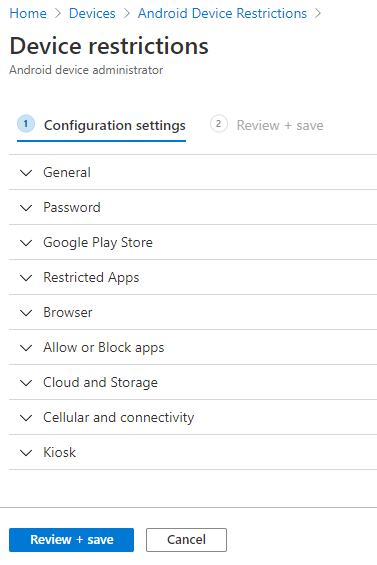 Above is an example of the options that are available in an Android Device Restriction configuration policy.